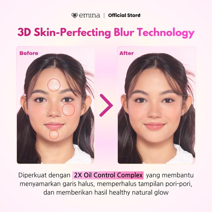 2. Untuk coverage lebih tinggi, gunakan Emina Daily Matte Cushion, Emina Matte Core Cushion atau Emina Glow Vibe Cushion sebelum menggunakan Emina GlowFixer Blur Powder.